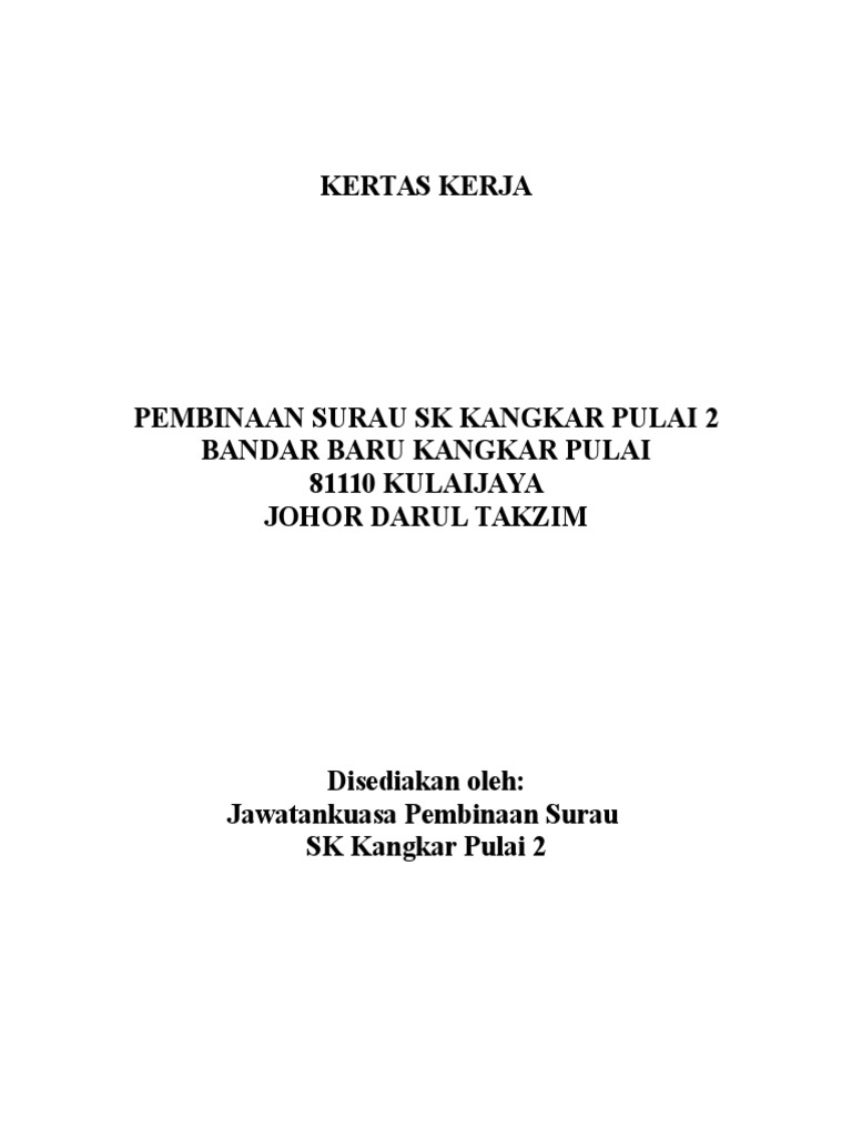 . Kertas kerja atau proposal untuk membina dan mengubahsuai bangunan by Kasuma_Majid_5038 in Types School Work proposal dan kertas kerja. Kerja kursus pendek 6 kertas kerja 1 kssr 1 lirik lagu 2 mte 3107. Sehubungan dengan itu dengan rasa penuh hormat dan rendah diri pihak Jawatankuasa Pembinaan Surau Al-Makmur berharap kepada sumbangan pihak-pihak yang ingin memberikan sumbangan berupa kewangan dan sebagainya demi tercapainya cita-cita seluruh penduduk di.